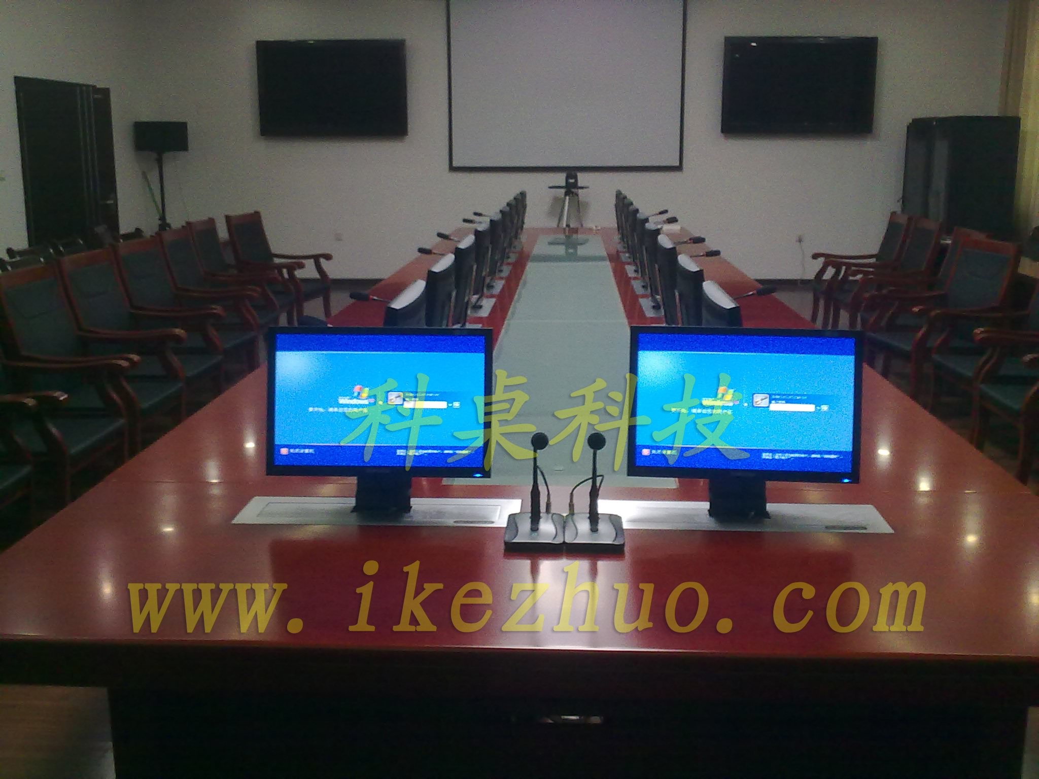 需要使用顯示屏時,隱藏在會議桌內(nèi)部的升降機把顯示屏從會議下面升到桌子表面;當不使用顯示屏時,升降機自動下降,顯示屏隱藏在會議桌內(nèi)部,防盜、防塵;保持桌子表面的平整和美觀。