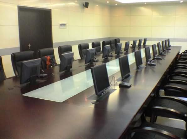 當(dāng)需要舉行會議時隱藏在會議桌內(nèi)的升降器把液晶顯示器從會議桌下面自動升到桌面并仰成一定角度,